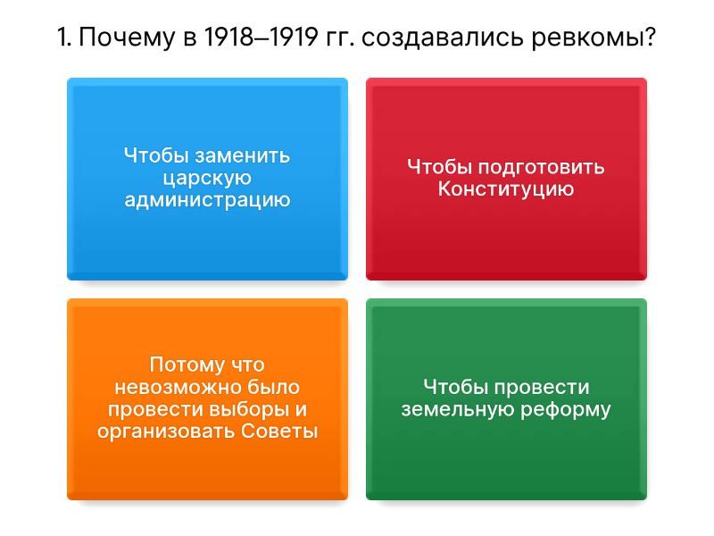 1) 1. Почему в 1918–1919 гг. создавались ревкомы? a) Чтобы заменить царскую администрацию b) Чтобы подготовить Конституцию c) Потому что невозможно было провести выборы и организовать Советы d) Чтобы провести земельную реформу 2) 2. Что входило в функции ревкомов? a) А) Только военное управление b) Б) Чрезвычайные полномочия по управлению территориями c) В) Контроль торговли d) Г) Налогообложение 3) 3. Кто сыграл большую роль в организации власти в Уральске? a) А. Байтурсынов b) М. Тунганшин c) С. Мендешев d) А. Айтиев 4) 4. Когда был образован Казревком? a) А) Март 1920 b) Б) Июль 1919 c) В) Август 1920 d) Г) Май 1918 5) 5. Кто из председателя возглавил Казревком? a) А. Байтурсынов b) В. Радус-Зенькович c) С. Пестковский d) А. Жангельдин 6) 6. Как называлась газета Казревкома? a) А) «Бірлік» b) Б) «Ушкын» c) В) «Алаш» d) Г) «Тіршілік» 7) период существования Казревкома? a) С 10 июля 1919 г. по 10 октября 1920 г. b) С 10 марта 1920 г. по 10 март 1921 г. c) С 12 января 1918 г. по 15 июль 1919 г. d) С 9 октября 1920 г. по 10 декабрь 1922 г. 8) 8. Почему большевикам было выгодно включить алашевцев в Казревком? a) А) Чтобы обучить их управлению b) Б) Чтобы ослабить движение национальных автономистов c) В) Чтобы создать единую партию d) Г) Чтобы увеличить численность аппарата 9) 9. Кто из деятелей Алаш Орды добился амнистии для своих соратников? a) А) А. Айтиев b) Б) А. Ермеков c) В) А. Букейханов d) Г) Х. Габбасов 10) 10. Кто защищал территориальные права казахов в Москве в 1920 г.? a) А) М. Тунганшин b) Б) А. Ермеков c) В) С. Сейфуллин d) Г) В. Лукашев 11) 11. Когда был подписан декрет об образовании КАССР? a) А) 10 июля 1919 b) Б) 26 августа 1920 c) В) 4 октября 1920 d) Г) 18 апреля 1925 12) 12. Какая губерния была включена в КАССР в сентябре 1920 г.? a) А) Семиреченская b) Б) Сырдарьинская c) В) Оренбургская d) Г) Астраханская 13) 13. Когда прошёл Учредительный съезд Советов КАССР? a) А) 4–12 октября 1920 b) Б) 18 апреля 1925 c) В) 26 августа 1920 d) Г) 10 июля 1919 14) 14. Когда республика получила название «Казахская АССР»? a) А) 1920 b) Б) 1921 c) В) 1923 d) Г) 1925