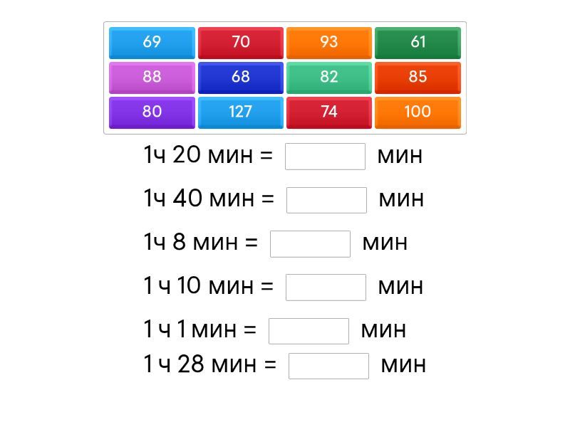 1ч 20 мин = ____ мин 1ч 40 мин = ____ мин 1ч 8 мин = ____ мин 1 ч 10 мин = ____ мин 1 ч 1 мин = ____ мин 1 ч 28 мин = ____ мин