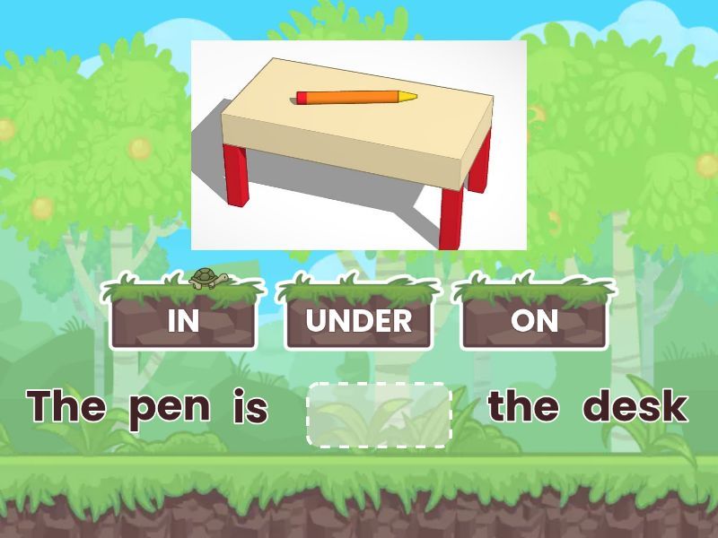 The pen is ____ the desk The book is ____ the desk The ruler is ____ the pencil case The pencil is ____ the books The bag is ____ the chair. The book is ____ the pencilcase. The pencil is ____ the desk. The book is ____ the bag.