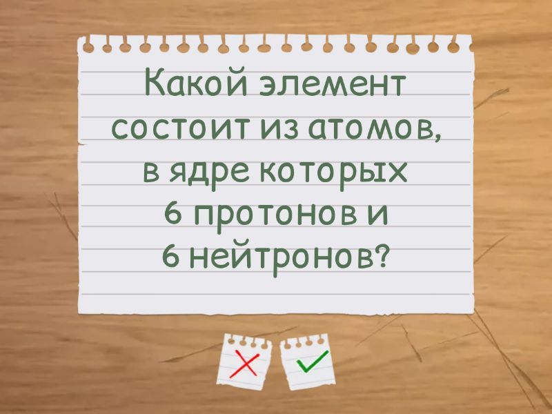 Сколько протонов находится в атоме кислорода (O), если его порядковый номер — 8? - 8 протонов, Атом какого элемента содержит 7 протонов? - азот, Если в атоме углерода 6 электронов, то сколько у него протонов? - 6, Какой элемент состоит из атомов, в ядре которых 6 протонов и 6 нейтронов? - углерод, Как называется отрицательно заряженная частица, которая вращается вокруг ядра атома? - электрон,