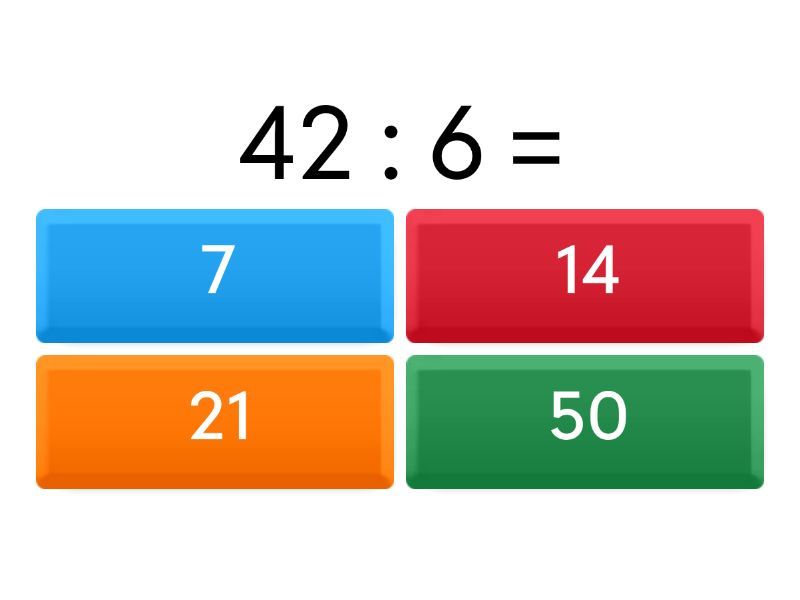 1) 42 : 6 = a) 7 b) 14 c) 21 d) 50 2) 24 : 6 = a) 4 b) 49 c) 51 d) 67 3) 30 : 6 = a) 5 b) 6 c) 23 d) 27 4) 48 : 6 = a) 3 b) 8 c) 39 d) 55 5) 0 : 6 = a) 0 b) 1 c) 60 d) 6 6) 72 : 6 = a) 2 b) 7 c) 12 d) 65 7) 60 : 6 = a) 10 b) 12 c) 19 d) 76 8) 6 : 6 = a) 1 b) 10 c) 22 d) 56 9) 18 : 6 = a) 3 b) 20 c) 29 d) 82 10) 54 : 6 = a) 9 b) 11 c) 25 d) 53 11) 66 : 6 a) 10 b) 6 c) 11 d) 0