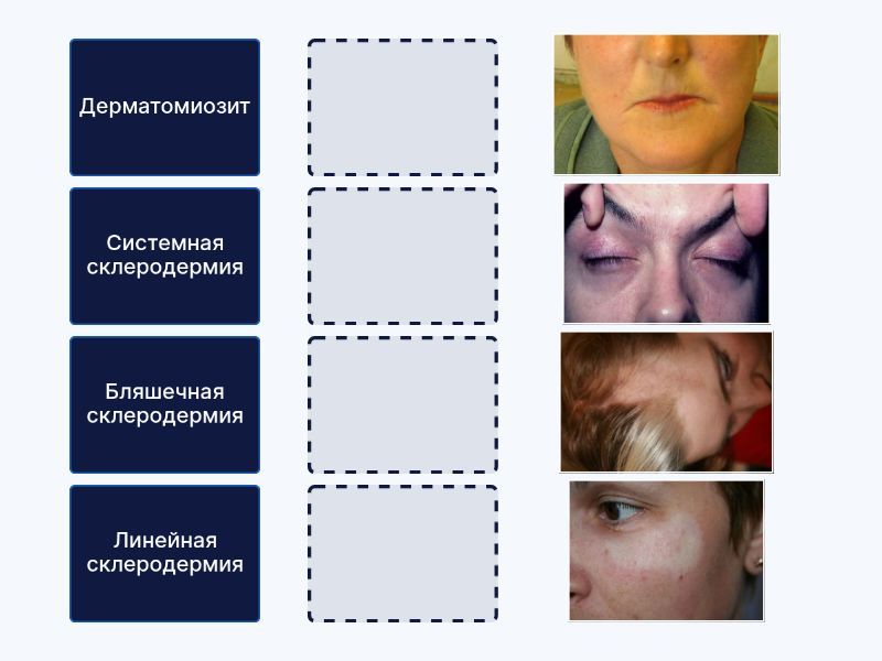 Бляшечная склеродермия, Линейная склеродермия, Системная склеродермия, Дерматомиозит,