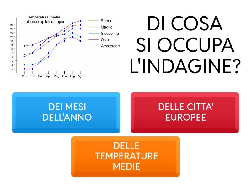 1) DI COSA SI OCCUPA L'INDAGINE? a) DEI MESI DELL'ANNO b) DELLE CITTA' EUROPEE c) DELLE TEMPERATURE MEDIE 2) QUAL E' LA CITTA' PIU' FREDDA A GENNAIO? a) OSLO b) MADRID c) AMSTERDAM d) ROMA 3) QUALI SONO LE DUE CITTA' CHE HANNO LA STESSA TEMPERATURA A FEBBRAIO? a) MADRID - STOCCOLMA b) ROMA - OSLO c) MADRID - OSLO d) ROMA - AMSTERDAM 4) QUAL E' LA CITTA' PIU' CALDA DELLE ALTRE NEI MESI DELL'ANNO? a) ROMA b) MADRID c) STOCCOLMA d) OSLO 5) QUANTI GRADI CI SONO A MADRID IN MARZO? a) 15° b) 17° c) 21° d) 27°