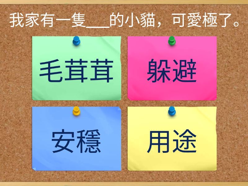 1) 我家有一隻___的小貓,可愛極了。 a) 毛茸茸 b) 躲避 c) 安穩 d) 用途 2) 她對所有新鮮事物都感到____,甚麼都想試一試。 a) 舒服 b) 好奇 c) 蓬鬆鬆 d) 毛茸茸 3) 這支彩色筆的____很多,可以用來畫圖、寫筆記和做記號。 a) 安穩 b) 好奇 c) 用途 d) 躲避 4) 這片草地____的,躺在上面很舒服。 a) 毛茸茸 b) 蓬鬆鬆 c) 好奇 d) 追 5) 這雙鞋子很____,雖然設計簡單,但用料上乘。 a) 舒服 b) 用途 c) 好奇 d) 安穩 6) 她這幾天都不理睬我,好像有意____我。 a) 好奇 b) 舒服 c) 追 d) 躲避 7) 我和弟弟____着足球跑。 a) 追 b) 好奇 c) 用途 d) 舒服 8) 他的車開得很____,我們都很放心讓他當司機。 a) 用途 b) 躲避 c) 安穩 d) 追