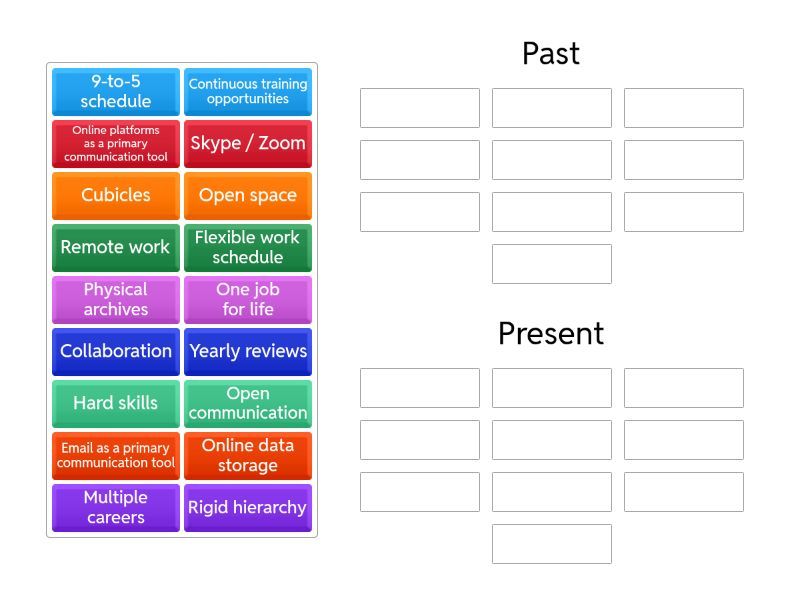 Past: Email as a primary communication tool, Hard skills, One job for life, 9-to-5 schedule, Yearly reviews, Physical archives, Rigid hierarchy, Cubicles, Present: Skype / Zoom, Collaboration, Open communication, Remote work, Online data storage, Continuous training opportunities, Multiple careers, Flexible work schedule, Open space, Online platforms as a primary communication tool,