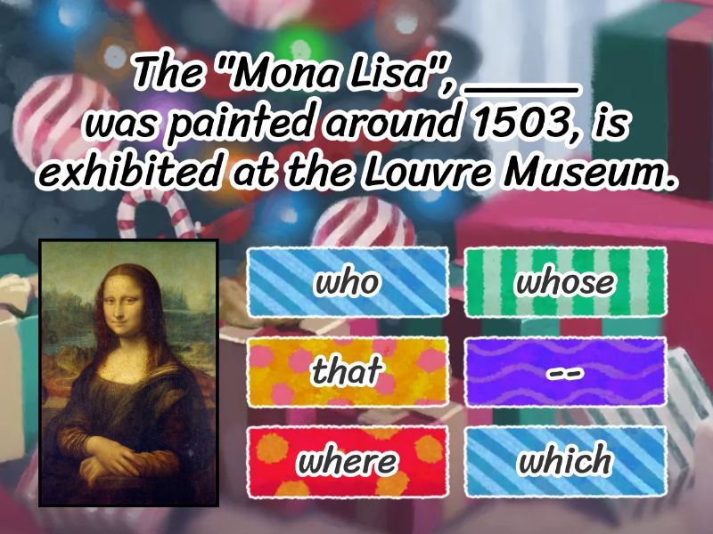 1) The "Mona Lisa", _____ was painted around 1503, is exhibited at the Louvre Museum. a) who b) whose c) that d) -- e) where f) which 2) Italy is a country _____ beauty and culture attract many tourists. a) who b) whose c) that d) ------ e) where f) which 3) Lucio Battisti, ___ was an important Italian singer, died in 1998 in Milan. a) who b) whose c) that d) -- e) whom f) which 4) This is the street artist _____ we saw 3 years ago in Duluth. a) who b) whose c) that d) -- e) whom f) which 5) Those rich people, _____ boat capsized offshore, were rescued by helicopter. a) who b) where c) -- d) that e) whose f) which 6) This is the program_____ I downloaded yesterday. It's great. a) who b) where c) -- d) that e) whom f) which 7) The Police have just found the building _____ the robbers were hiding. a) when b) which............ in c) whose d) where e) who f) how 8) Have you received the carrots _____ you ordered a week ago? a) when b) which c) whose d) where e) -- f) that 9) The lawyer said: "Mr. Trent, ____ I defend and represent, is clearly innocent."  a) which b) that c) whom d) who e) whose f) ---- 10) My Nigerian friend, ___ I went to the North Pole with, is leaving for Antartica. a) which b) that c) --- d) who e) whose f) whom