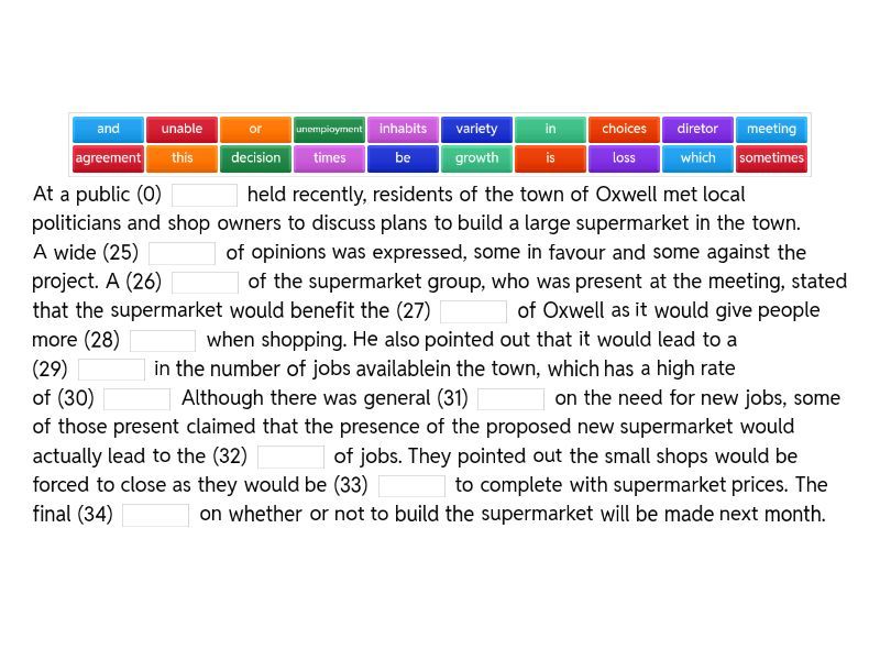 At a public (0) ____ held recently, residents of the town of Oxwell met local politicians and shop owners to discuss plans to build a large supermarket in the town. A wide (25) ____ of opinions was expressed, some in favour and some against the project. A (26) ____ of the supermarket group, who was present at the meeting, stated that the supermarket would benefit the (27) ____ of Oxwell as it would give people more (28) ____ when shopping. He also pointed out that it would lead to a (29) ____ in the number of jobs availablein the town, which has a high rate of (30) ____ Although there was general (31) ____ on the need for new jobs, some of those present claimed that the presence of the proposed new supermarket would actually lead to the (32) ____ of jobs. They pointed out the small shops would be forced to close as they would be (33) ____ to complete with supermarket prices. The final (34) ____ on whether or not to build the supermarket will be made next month.
