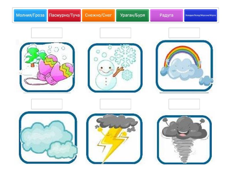 Жарко/Жара, Радуга, Молния/Гроза, Мороз, Ураган/Буря, Пасмурно/Туча, Ветрено/Ветер, Гроза, Снежно/Снег, Холодно/Холод/Морозно/Мороз, Дождь, Облачно,