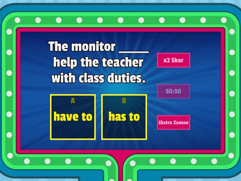 1) The monitor _____ help the teacher with class duties. a) have to b) has to 2) We _____ be on time for the first lesson every morning. a) have to b) has to 3) A student _____ raise hand before speaking in the class. a) have to b) has to 4) The counsellor _____ listen to students' problems. a) has to b) have to 5) We _____ keep the classroom tidy and clean. a) has to b) have to 6) She _____ take notes carefully during the lecture. a) have to b) has to 7) Students _____ attend lessons regularly to be successful. a) has to b) have to 8) I _____ take care of class objects; I shouldn't break them. a) has to b) have to 9) He _____ finish the task before the break time. a) has to b) have to 10) We _____ discuss in groups to find the answer. a) has to b) have to 11) The assistant _____ help the students. a) have to b) has to 12) You _____ present your work to the class today. a) have to b) has to 13) My classmate _____ wait for his turn to speak. a) have to b) has to 14) They _____ copy from the board into their notebooks. a) has to b) have to 15) We _____ decide on duties together with the teacher. a) have to b) has to 16) The teacher _____ prepare interesting activities for us. a) have to b) has to 17) She _____ repeat after the teacher. a) have to b) has to 18) You _____ enter the class quietly when you are late. a) has to b) have to 19) Everyone _____ do their best in every activity. a) have to b) has to 20) He _____ study for exams to get high marks. a) have to b) has to