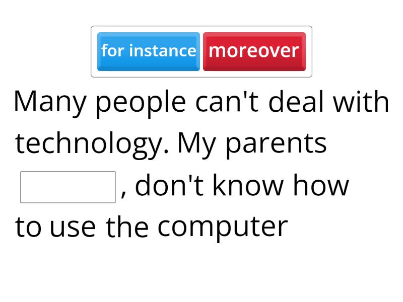 Many people can't deal with technology. My parents ____, don't know how to use the computer And this, ____, is the story of Portuguese wine over the past 20 years. ____ to a more pleasent one, are you going to the party tonight? I'm great at playing volleyball. My brother, ____, is better at playing soccer. Everyone ____ you is watching this TV show! ____all English learners have difficulties at some point. The violence is growing in this area. ____ we need to move out. -Would you like to go camping with us?-Of course I would, I love camping! ____ I need some time in touch with nature.