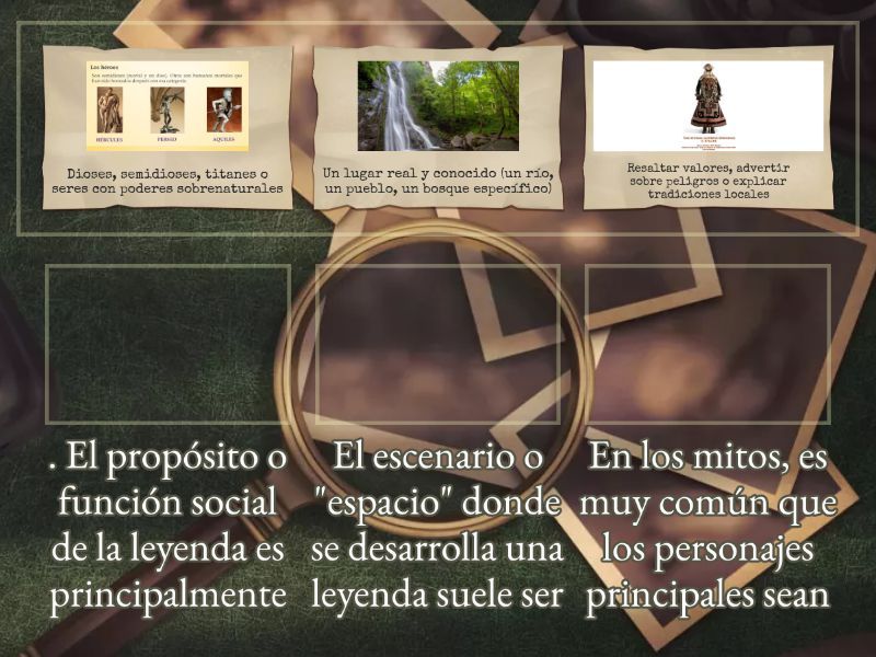 Dioses, semidioses, titanes o seres con poderes sobrenaturales - En los mitos, es muy común que los personajes principales sean, Un lugar real y conocido (un río, un pueblo, un bosque específico) - El escenario o "espacio" donde se desarrolla una leyenda suele ser, Resaltar valores, advertir sobre peligros o explicar tradiciones locales - . El propósito o función social de la leyenda es principalmente,