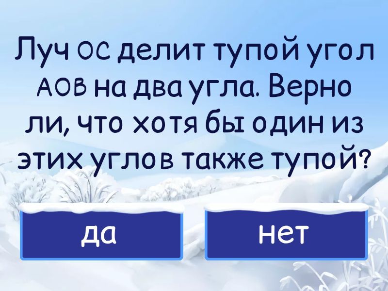1) Луч OC делит тупой угол AOB на два угла. Верно ли, что хотя бы один из этих углов также тупой? a) да b) нет 2) На прямой расположены три точки A, B, C. Известно, что AВ < AС < BC. Какая из точек лежит между двумя другими? a) А b) В c) С 3) уч OC — биссектриса неразвернутого угла AOB,луч ОD — биссектриса неразвернутого угла AOС. Определите, каким является ∠BOD? Если, ∠АOC< 60° a) тупым b) прямым c) острым 4) На прямой отмечены три точки. Верно ли, что один из образовавшихся отрезков меньше суммы двух других? a) да b) нет 5) Внутри неразвернутого угла с вершиной O проведены лучи OA и OB. Верно ли, что если угол AOB острый, то данный угол также острый? a) да b) нет 6) Луч OC делит неразвернутый угол AOB на два угла. Верно ли, что если угол АОС - прямой, то угол АОВ - тупой? a) да b) нет