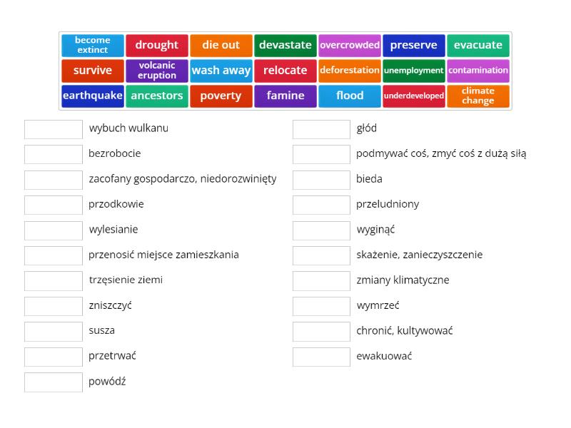climate change - zmiany klimatyczne, deforestation - wylesianie, famine - głód, poverty - bieda, unemployment - bezrobocie, drought - susza, flood - powódź, earthquake - trzęsienie ziemi, contamination - skażenie, zanieczyszczenie, volcanic eruption - wybuch wulkanu, preserve - chronić, kultywować, evacuate - ewakuować, relocate - przenosić miejsce zamieszkania, survive - przetrwać, devastate - zniszczyć, wash away - podmywać coś, zmyć coś z dużą siłą, overcrowded - przeludniony, underdeveloped - zacofany gospodarczo, niedorozwinięty, ancestors - przodkowie, die out - wymrzeć, become extinct - wyginąć,