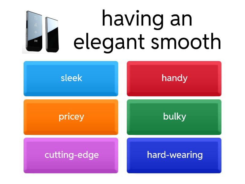 1) having an elegant smooth a) sleek b) handy c) pricey d) bulky e) cutting-edge f) hard-wearing 2) easy to use or to do a) lightweight b) bulky c) obsolete d) handy e) cumbersome f) useless 3) overpriced, too expensive a) cumbersome b) pricey c) resilient d) reasonable e) fragile f) hard-wearing 4) large and difficult to move or carry a) resilient b) exorbitant c) hard-wearing d) sleek e) elegant f) bulky 5)  very modern and with all the newest features a) fragile b) leightweight c) cutting-edge d) hard-wearing e) bulky f) handy 6) that lasts a long time and remains in good condition a) pricey b) innovative c) plain d) exorbitant e) hard-wearing f) reasonable 7) large and heavy, difficult to carry a) fragile b) cumbersome c) obsolete d) plain e) exorbitant f) lightweight 8) made of thinner material and less heavy than usual a) lightweight b) sleek c) cutting-edge d) innovative e) hard-wearing f) resilient 9) introducing or using new ideas, ways of doing sth, etc. a) obsolete b) bulky c) hard-wearing d) plain e) innovative f) useless 10) no longer used because sth new has been invented a) bulky b) convenient c) innovative d) fragile e) obsolete f) cumbersome 11) useful, easy or quick to do a) hard-wearing b) sleek c) convenient d) exorbitant e) elegant f) bulky 12) not useful, not doing or achieving what is needed or wanted a) fragile b) handy c) innovative d) useless e) plain f) sleek 13) able to quickly return to its usual shape after being bent, stretched, or pressed a) plain b) fragile c) resilient d) sleek e) reasonable f) bulky 14) easily broken or damaged a) cumbersome b) pricey c) hard-wearing d) resilient e) fragile f) obsolete 15) simple or basic in character a) handy b) cumbersome c) bulky d) cutting-edge e) plain f) lightweight