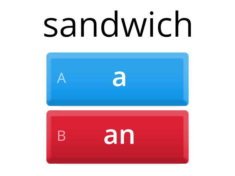 1) sandwich a) a b) an 2) tomato a) a b) an 3) orange a) a b) an 4) pear a) a b) an 5) egg a) a b) an 6) drink a) a b) an 7) apple a) a b) an 8) biscuit a) a b) an 9) banana a) a b) an 10) ice-cream a) a b) an