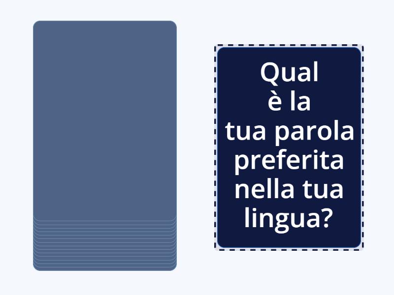 Cosa mangi a colazione?, Di dove sei?, Dove abiti?, Quanti anni hai?, Che lavoro fai? , Perché studi l'italiano? , Hai fratelli o sorelle?, Che cosa ti piace fare nel tempo libero?, Conosci una canzone italiana?, Conosci un film italiano?, Qual è la tua città italiana preferita?, Qual è il tuo piatto preferito?, Qual è la tua parola italiana preferita?, Qual è la tua parola preferita nella tua lingua?, Che lingue parli?, Dove sei andato in vacanza?.
