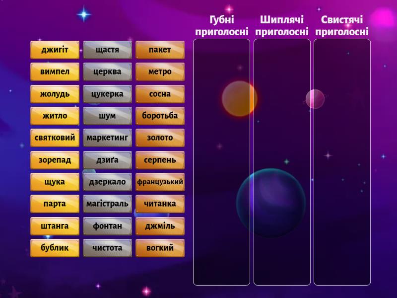 Губні приголосні: боротьба, пакет, вимпел, магістраль, фонтан, бублик, парта, вогкий, маркетинг, французький, метро, Шиплячі приголосні: штанга, жолудь, джигіт, чистота, щастя, шум, житло, джміль, читанка, щука, Свистячі приголосні: серпень, зорепад, дзеркало, церква, святковий, золото, дзиґа, цукерка, сосна,