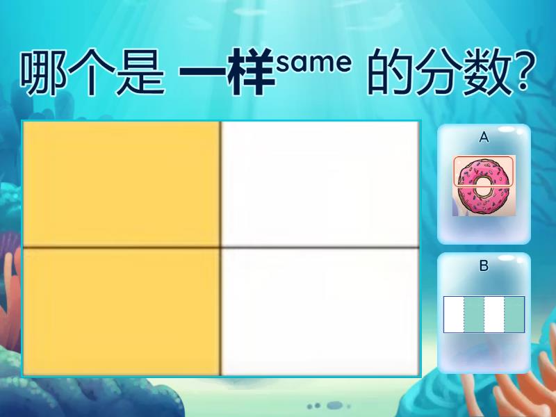 1) 蓝色的部分是几分之几? a) 二分之一 b) 四分之一 c) 四分之三 2) 涂色的部分是西瓜的__________ a) 四分之三 b) 二分之一 c) 整个 3) 这汉堡包是________ a) 二分之一 b) 四分之一 c) 整个 4) 涂色colour 的部分是西瓜的__________ a) 四分之一 b) 二分之一 c) 四分之三 5) 左边left 的巧克力是__________ a) 四分之一 b) 二分之一 c) 四分之二 6) 饼干是不是切成二分之一 ? a) 是 b) 不是 7) 这披萨是________ a) 二分之一 b) 四分之一 c) 整个 8) 白色white 部分占了_________ a) 四分之一 b) 四分之二 c) 四分之三 9) 哪个是 一样same 的分数? a) b) 10) 哪个是 一样 的分数? a) b)