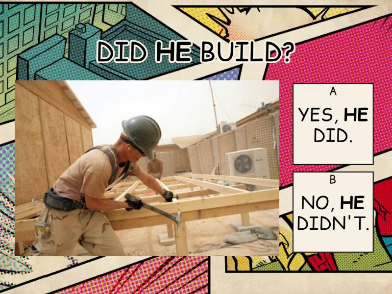 1) DID HE BUILD? a) YES, HE DID. b) NO, HE DIDN'T. 2) DID HE DRIVE? a) YES, HE DID. b) NO, HE DIDN'T. 3) DID SHE HELP? a) YES, SHE DID. b) NO, SHE DIDN'T. 4) DID HE SCORE GOALS? a) YES, HE DID. b) NO, HE DIDN'T. 5) DID SHE GROW? a) YES, SHE DID. b) NO, SHE DIDN'T.