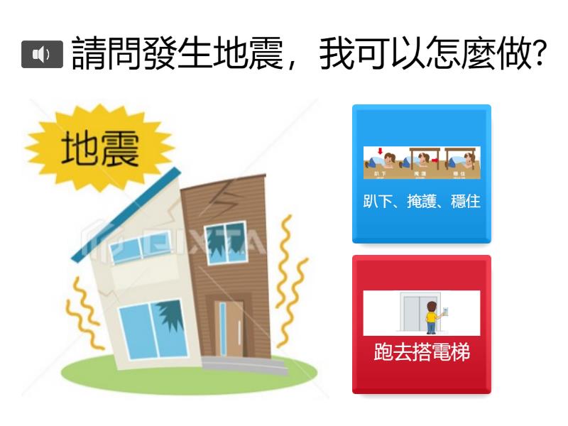 1) 請問發生地震,我可以怎麼做? a) 趴下、掩護、穩住 b) 跑去搭電梯 2) 當地震發生,哪個行為是正確的? a) 把爐火關掉 b) 把門窗關起來 c) 光腳跑出去 3) 發生地震要逃生時,我可以怎麼做? a) 搭電梯 b) 走樓梯 4) 緊急避難包應該放在家中哪個位子? a) 大門口旁 b) 房間內 5) 發生地震時,我可以躲在哪個地方,比較安全? a) 窗戶旁 b) 桌子底下 c) 櫃子旁邊