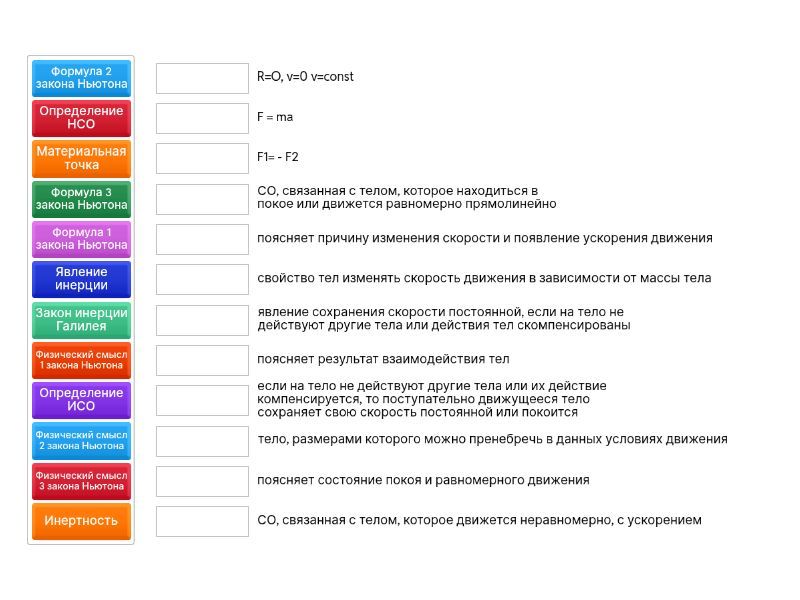 Определение ИСО - СО, связанная с телом, которое находиться в покое или движется равномерно прямолинейно, Определение НСО - СО, связанная с телом, которое движется неравномерно, с ускорением, Формула 1 закона Ньютона - R=O, v=0 v=const, Формула 2 закона Ньютона - F = ma, Формула 3 закона Ньютона - F1= - F2, Явление инерции - явление сохранения скорости постоянной, если на тело не действуют другие тела или действия тел скомпенсированы, Материальная точка - тело, размерами которого можно пренебречь в данных условиях движения, Физический смысл 1 закона Ньютона - поясняет состояние покоя и равномерного движения, Физический смысл 2 закона Ньютона - поясняет причину изменения скорости и появление ускорения движения, Физический смысл 3 закона Ньютона - поясняет результат взаимодействия тел, Инертность - свойство тел изменять скорость движения в зависимости от массы тела, Закон инерции Галилея - если на тело не действуют другие тела или их действие компенсируется, то поступательно движущееся тело сохраняет свою скорость постоянной или покоится,