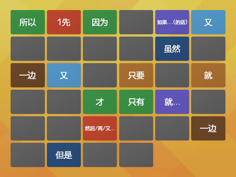 因为 - 所以, 如果....(的话) - 就..., 1先 - 然后/再/又..., 又 - 又, 一边 - 一边, 虽然 - 但是, 只要 - 就, 只有 - 才, 除了 - 以外,都/还/也..., 一点儿 - 也/都 + 不/没, 越 - 越, 跟 - (不)一样, 比 - 一点儿/一些/得多/多了, 是 - 的, 不要/别 - 了!, 要/快要/就要 - 了., 都 - 了 (уже),