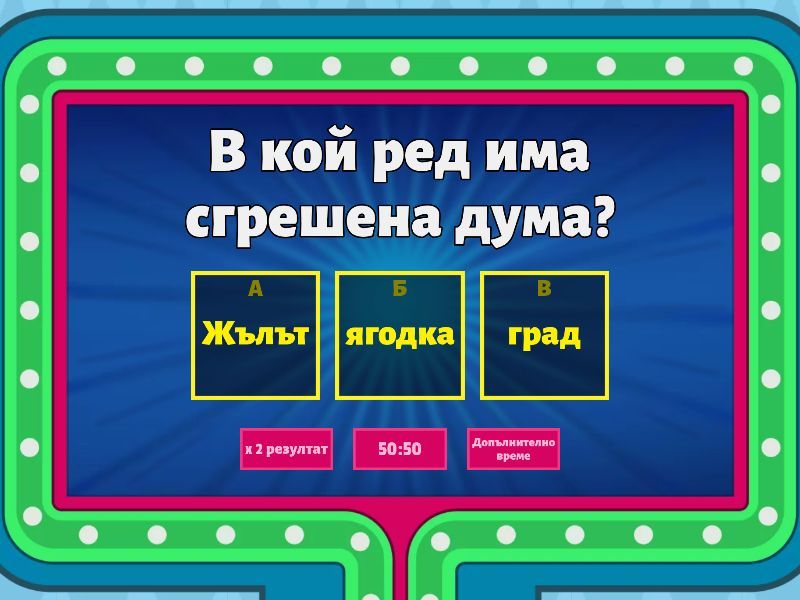 1) В кой ред НЯМА грешно написана дума?  a) Морков, левче, рипка b) Почифка, връзка, чофка c) Обувки, шоколад, пеперудка 2) В кой ред има сгрешена дума? a) Жълът b) ягодка c) град 3) Има ли грешка в изречението: Мама ми купи книшка с приказки.  a) да b) не c) не знам 4) Има ли грешка в изречението: С леля Здравка сме съседки. a) ДА b) НЕ c) НЕ ЗНАМ 5) Коя е сгрешената дума в изречението: Ходих на разходка с новите си обуфки. a) разходка b) новите c) обуфки 6) На кой ред има неправилно записани думи? a) студ, лед, мраз b) крив, бряг, град c) сняк, бърз, крък 7) Вярно ли е, че гласните звукове се делят на звучни и беззвучни? a) Да b) Не 8) Колко са двойките звучни и беззвучни съгласни? a) 3 b) 4 c) 5 d) 6 9) Коя буква има два звука? a) б b) д c) з d) я e) ч f) г