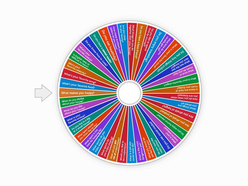 What's your favorite food?, What's your favorite song?, Who's your favorite celebrity?, Is English easy or difficult to learn?, What's your favorite cuisine?, Do you know how to cook?, Do you have a sweet tooth?, Do you eat healthily?, How many brothers and sisters do you have?, Are you close to your family?, What things do you do together with your family?, Do you have a best friend?, Do you like to spend time by yourself?, Do you enjoy traveling?, What time do you usually get up?, What is your favorite store?, Do you buy things online?, What was the last item you bought?, What kind of music do you like?, Who is your favorite singer?, Is there any kind of music you dislike?, How do you relax when you are stressed?, What things are you afraid of?, Are you afraid of heigts?, Are you afraid of snakes?, Do you enjoy horror movies?, What is your favorite website?, Do you use social media?, Do you read the news online?, What job would be perfect for you?, What is the most dangerous job?, What is a job you could never do?, Would you like to be a superhero?, How can you get rid of a bad habbit?, What sports do you enjoy playing?, What sports do you enjoy watching?, What sport is the best for keeping fit?, What sport would you most like to try?, Do you live in a big or a small house?, What is your favorite animal?, What do you like about your house?, What do you dislike about your house?, What makes you happy?.