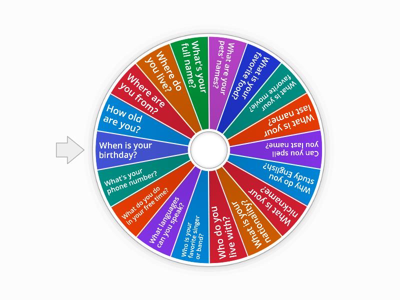 How old are you?, Where are you from?, Where do you live?, What's your full name?, What are your pets' names?, What is your favorite food?, What is your favorite movie?, What is your last name?, Can you spell you last name?, Why do you study English?, What is your nickname?, What is your nationality?, Who do you live with?, Who is your favorite singer or band?, What languages can you speak?, What do you do in your free time?, What's your phone number?, When is your birthday?.