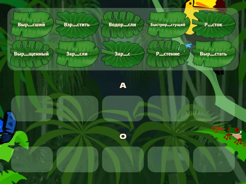 А: Выр...стать, Выр...щенный, Взр...стить, Р...стение, Быстрор...стущий, О: Р...сток, Зар...с, Зар...сли, Выр...сший, Водор...сли,