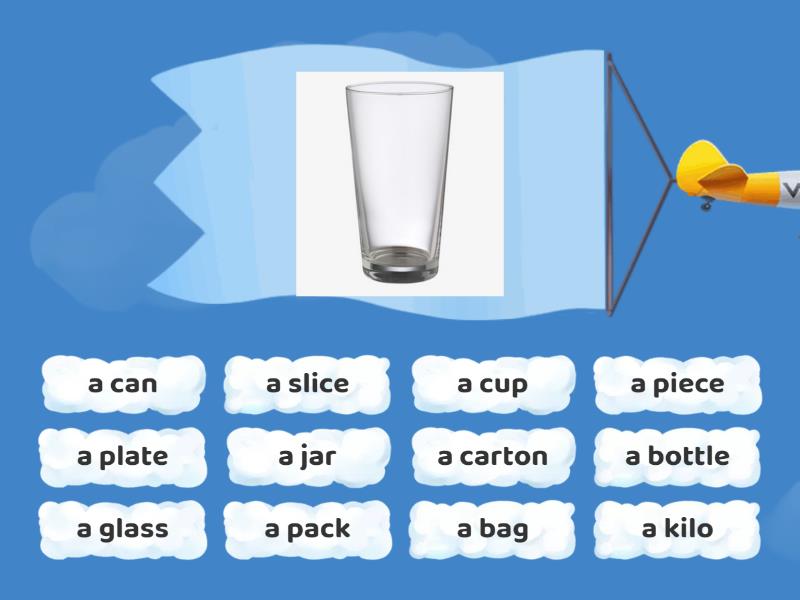 a glass, a cup, a bottle, a piece, a carton, a bag, a pack, a jar, a slice, a plate, a can, a kilo,