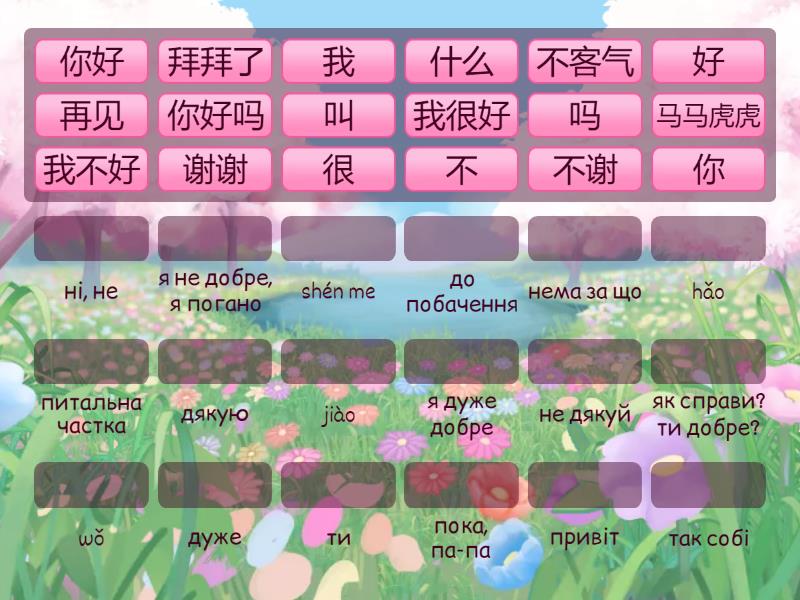 你 - ти, 好 - hǎo, 你好 - привіт, 我 - wǒ, 叫 - jiào, 什么 - shén me, 谢谢 - дякую, 再见 - до побачення, 拜拜了 - пока, па-па, 吗 - питальна частка, 你好吗 - як справи? ти добре?, 很 - дуже, 我很好 - я дуже добре, 不 - ні, не, 我不好 - я не добре, я погано, 马马虎虎 - так собі, 不客气 - нема за що, 不谢 - не дякуй,