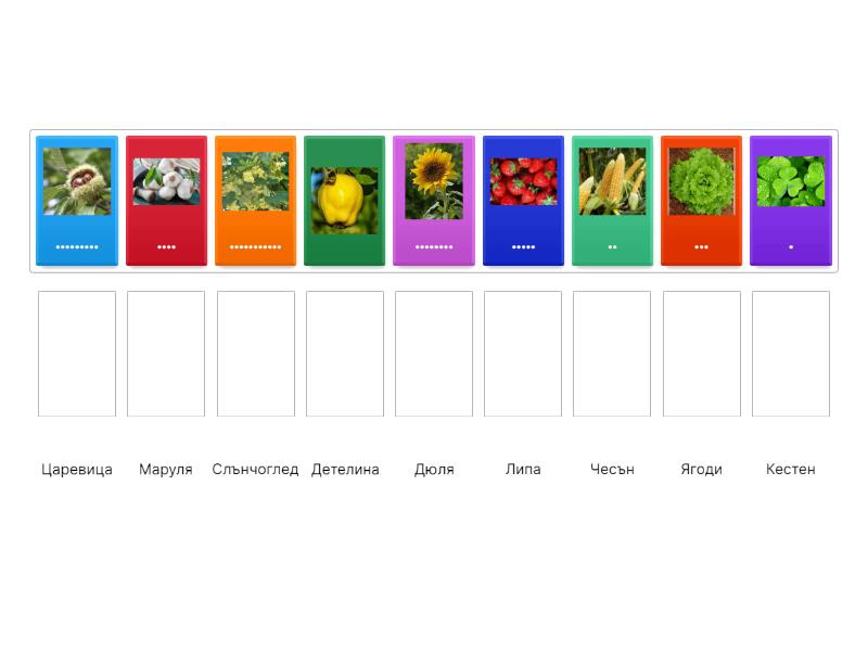 . - Детелина, .. - Царевица, ... - Маруля, .... - Чесън, ..... - Ягоди, ......... - Кестен, ........ - Слънчоглед, ........... - Липа, Дюля,