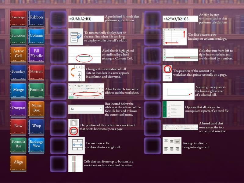 Active Cell - A cell that is highlighted or outlined by a bold rectangle. Current Cell., Column - Cells that run from top to bottom in a worksheet and are identified by letters., Row - Cells that run from left to right in a worksheet and are identified by numbers., Name Box - Box located below the ribbon at the left end of the formula bar and it shows the current cell name., Ribbon - A broad band that runs across the top of the Excel window., Fill Handle - A small green square in the lower-right corner of a selected cell., Formula Bar - A bar located between the ribbon and the worksheet., Backstage View - Options that allows you to manipulate aspects of an excel file., Formula - An step by step written equation that performs calculations, Function - A predefined formula that performs a calculation., Merge - Two or more cells combined into a single cell., Align - Arrange in a line or bring into alignment., Wrap - To automatically display data on the next line when it is too long to display within the cell’s width., Boundary - The line between row headings or column headings., Landscape - The position of the content in a worksheet that prints horizontally on a page., Portrait - The position of the content in a worksheet that prints vertically on a page., Transpose - Changes the orientation of cell data so that data in a row appears in a column and vice versa.,