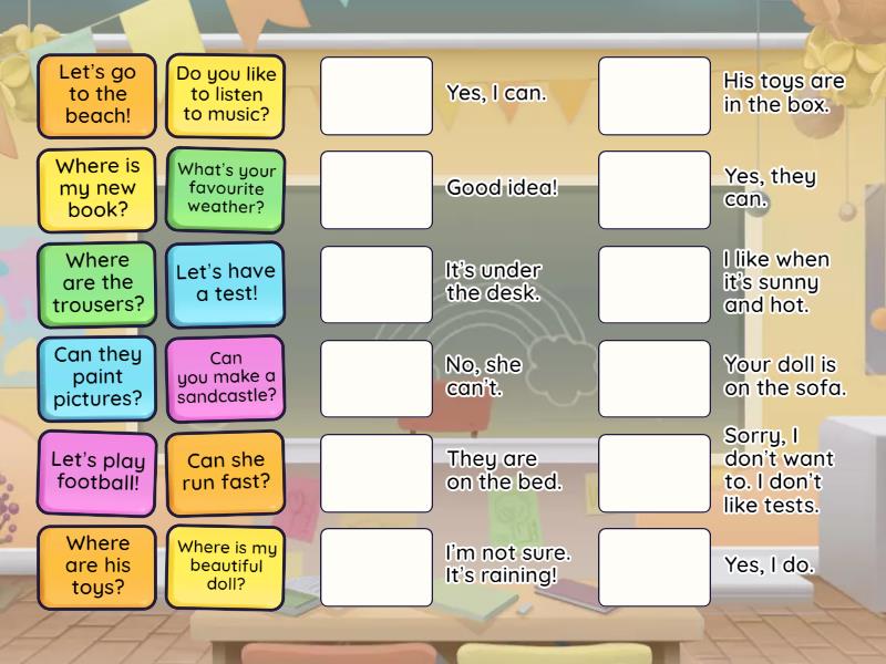 Where are the trousers? - They are on the bed., Where is my new book? - It’s under the desk., Where are his toys? - His toys are in the box., Where is my beautiful doll? - Your doll is on the sofa., Let’s play football! - Good idea! , Let’s have a test! - Sorry, I don’t want to. I don’t like tests., Let’s go to the beach! - I’m not sure. It’s raining! , What’s your favourite weather? - I like when it’s sunny and hot. , Do you like to listen to music? - Yes, I do. , Can you make a sandcastle? - Yes, I can., Can she run fast? - No, she can’t., Can they paint pictures? - Yes, they can.,