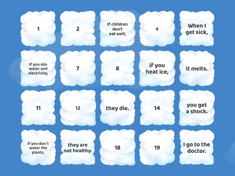 they are not healthy. - If children don't eat well,, you get a shock. - If you mix water and electricity,, it melts. - if you heat ice,, they die. - If you don´t water the plants,, I go to the doctor. - When I get sick,, I go windsurfing. - When it's sunny, I help her. - If my mum is busy,, if you hurry up. - We wait for you , , you can sit here. - If you want,, I drink more water. - When it´s hot,,