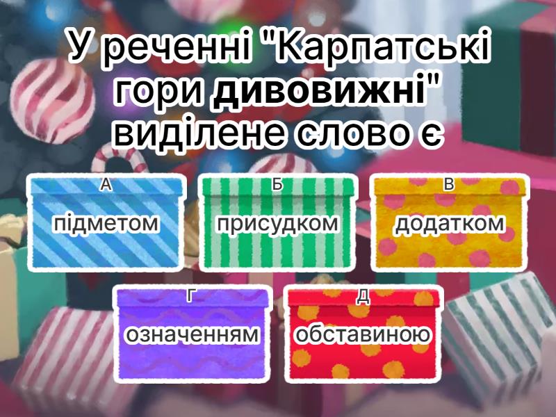 1) У реченні "Карпатські гори дивовижні" виділене слово є a) підметом b) присудком c) додатком d) означенням e) обставиною 2) У реченні "Декілька парубків скочило до танцю" підмет виділено a) правильно b) неправильно 3) У реченні "Приготуй локшину по-флотськи" виділене слово є a) додатком b) означенням c) обставиною d) підметом e) присудком 4) У реченні "Заведіть зошит у клітинку" виділене слово є a) додатком b) означенням c) обставиною d) підметом e) присудком 5) У реченні "Редактор попросив доопрацювати статтю" виділене слово є a) додатком b) означенням c) обставиною d) підметом e) присудком 6) У реченні "Друзі виявили бажання освіжитися" виділене слово є a) додатком b) означенням c) обставиною d) підметом e) присудком 7) У реченні "У вівторок поїду відпочивати до моря" виділене слово є a) додатком b) означенням c) обставиною d) підметом e) присудком 8) У реченні "Його погляд спрямований у море" виділене слово є a) додатком b) означенням c) обставиною d) підметом e) присудком 9) У реченні "Через затори я спізнився на десять хвилин" виділені слова є a) додатком b) означенням c) обставиною d) підметом e) присудком 10) У реченні "Іти мені додому неблизький світ" виділене слово є a) додатком b) означенням c) обставиною d) підметом e) присудком 11) У реченні "Боятися смерті - на світі не жити" виділене слово є a) додатком b) означенням c) обставиною d) підметом e) присудком 12) У реченні "Любить людей мене навчила мати" виділене слово є a) додатком b) означенням c) підметом d) присудком e) обставиною 13) У реченні "Чумацький Шлях освічує дорогу від Криму до Києва" виділені слова є a) додатком b) означенням c) обставиною d) підметом e) присудком 14) У реченні "Багряне сонце сутінню лісною у просвіт хмар показує кіно" підмет виділено a) правильно b) неправильно 15) У реченні "Обов'язково відвідайте Чигирин - славне козацьке місто" виділене слово є a) підметом b) присудком c) додатком d) означенням e) обставиною 16) У реченні "Клен навпроти тішить тінню" виділене слово є a) підметом b) присудком c) додатком d) означенням e) обставиною 17) У реченні "Команда з Одеси здобула переконливу перемогу" виділене слово є a) підметом b) присудком c) додатком d) означенням e) обставиною 18) У реченні "Від козаччини до Чорнобиля - усе українське життя стає епосом" виділене слово є a) підметом b) іменною частиною складеного присудка c) додатком d) означенням e) обставиною 19) У реченні "Весна - художник дуже знаменитий" виділене слово є a) підметом b) присудком c) додатком d) означенням e) обставиною 20) У реченні "Нашу індивідуальність створює пам'ять" виділене слово є a) підметом b) присудком c) додатком d) означенням e) обставиною 21) У реченні "Син від розкоші вередує" виділено a) обставину причини b) обставину мети c) обставину способу дії d) обставину міри і ступеня e) обставину часу