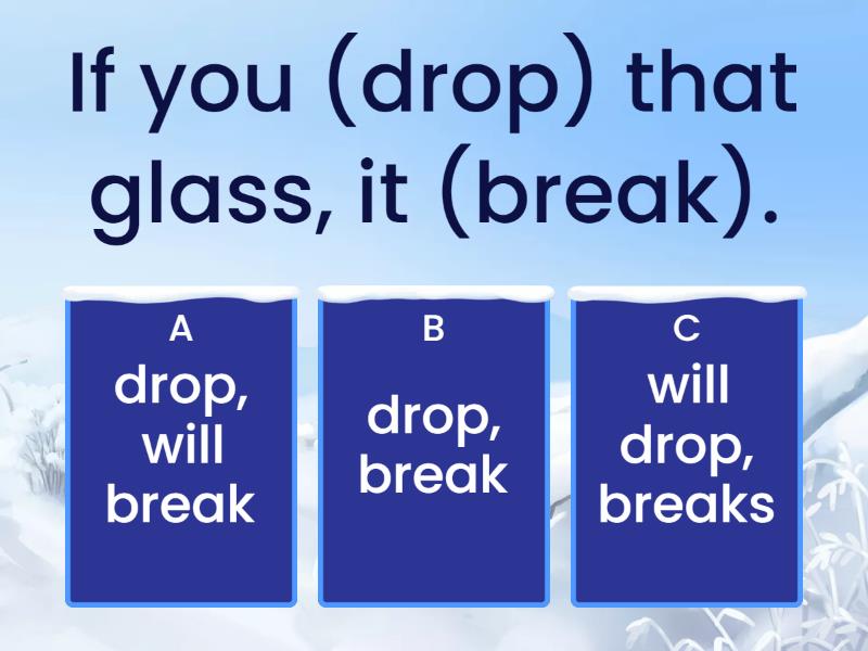 1) If I (go) to London, I (see) the Tower of London a) go, will see b) will go, see c) goes, sees 2) If it (rain), I (not, go) to the park. a) will rain, don't go b) rain, don't go c) rains, won't go 3) If I (have) enough money, I (buy) some new shoes. a) will have, buy b) have, will buy c) have, buy 4) She (miss) the bus if she (not, leave) soon. a) will miss, doesn't leave b) misses, won't leave c) will miss, don't leave 5) If I (study) today, I (go) to the party tonight. a) study, to go b) will study, go c) study, will go 6) If my friend (be) late, I (be) upset. a) is, will be b) will be, am c) be, am 7) If you (drop) that glass, it (break). a) will drop, breaks b) drop, break c) drop, will break 8) Your boss (be) angry if you (not, finish) the job. a) will be, don't finish b) is, won't finish c) is, doesn't finish 9) If you (eat) lots of sweets, you (have) a stomach-ache. a) eat, will have b) eat, had c) will eat, have 10) If she (not, go) to university, her parents (not, be) happy. a) won't go, b) doesn't go, won't be c) not goes, aren't 11) If you (tell) him the truth, he (not, be) angry. a) will tell, doesn't be b) will tell, isn't c) tell, won't be 12) If you (be) hot, you ( have to ) drink a lot a) are, will have to b) are, have to c) will be, will have to d) will be, have to 13) If it ( snow), it ( be) pretty cold a) snow, will be b) snows, will be c) snows, is 14) If it ( be) dark, I (not, like) driving a) is, won't like b) is, don't like c) will be, won't like