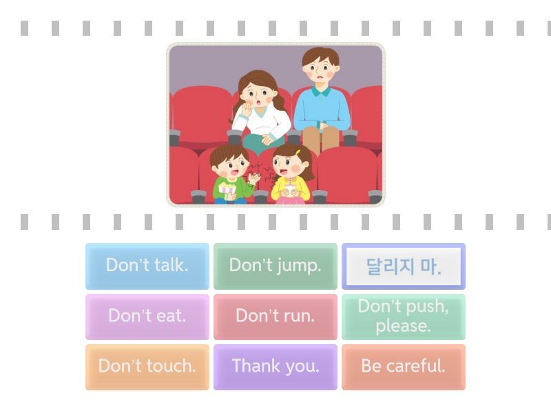 Don’t talk., Don’t run., Don’t touch., Don’t jump., Don’t eat., Don’t push, please., Be careful., Thank you.,