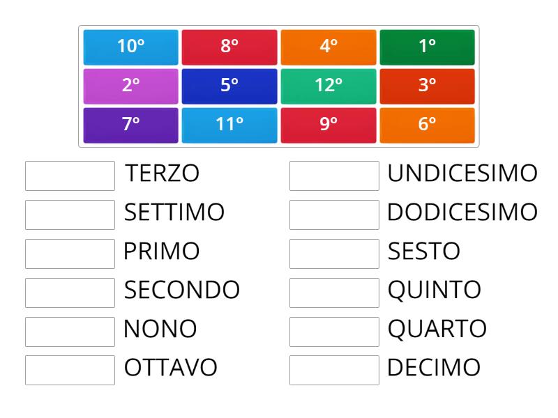 1° - PRIMO, 2° - SECONDO, 3° - TERZO, 4° - QUARTO, 5° - QUINTO, 6° - SESTO, 7° - SETTIMO, 8° - OTTAVO, 9° - NONO, 10° - DECIMO, 11° - UNDICESIMO, 12° - DODICESIMO,