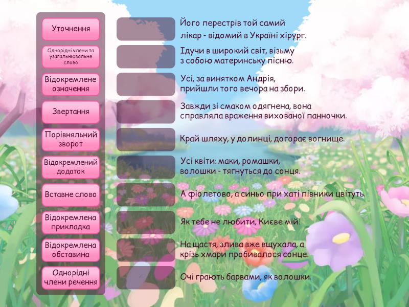 Відокремлене означення - Завжди зі смаком одягнена, вона справляла враження вихованої панночки., Звертання - Як тебе не любити, Києве мій!, Відокремлена обставина - Ідучи в широкий світ, візьму з собою материнську пісню., Однорідні члени речення - А фіолетово, а синьо при хаті півники цвітуть., Відокремлений додаток - Усі, за винятком Андрія, прийшли того вечора на збори., Відокремлена прикладка - Його перестрів той самий лікар - відомий в Україні хірург., Порівняльний зворот - Очі грають барвами, як волошки., Однорідні члени та узагальнювальне слово - Усі квіти: маки, ромашки, волошки - тягнуться до сонця., Уточнення - Край шляху, у долинці, догорає вогнище. , Вставне слово - На щастя, злива вже вщухала, а крізь хмари пробивалося сонце.,