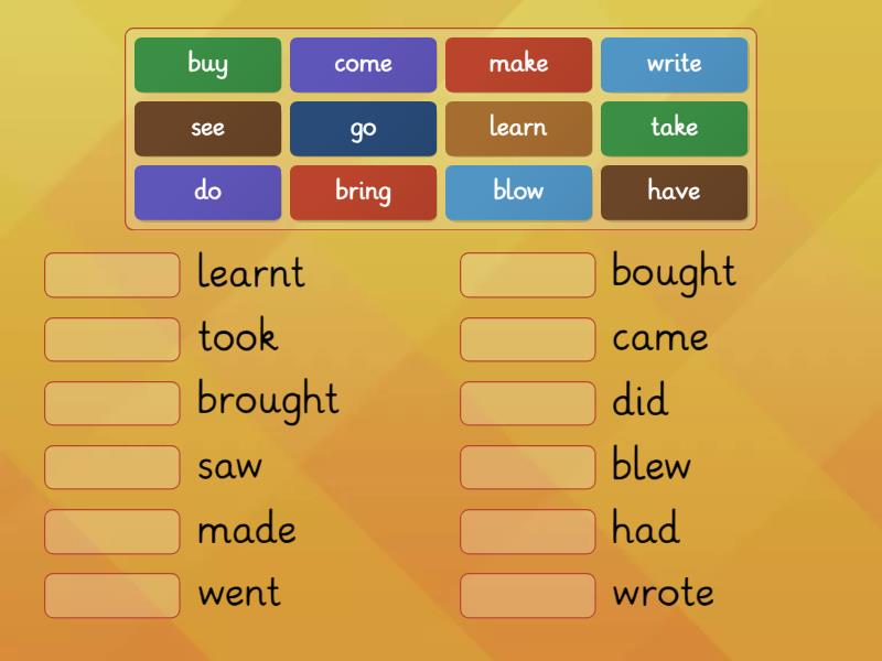 go - went, see - saw, come - came, learn - learnt, do - did, have - had, write - wrote, blow - blew, bring - brought, buy - bought, take - took, make - made,