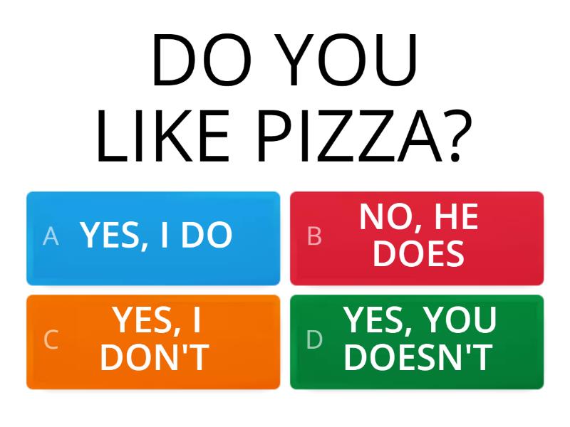 1) DO YOU LIKE PIZZA? a) YES, I DO b) NO, HE DOES c) YES, I DON'T d) YES, YOU DOESN'T 2) DOES MIKE PLAY FOOTBALL? a) YES, I DO b) YES, SHE DOES c) NO, I DON'T d) NO, HE DOESN'T 3) DO THEY HAVE DINNER AT SCHOOL? a) NO, THEY DO b) YES, SHE DOES c) NO, THEY DON'T d) NO, IT DOESN'T 4) DOES SHE LIVE IN LONDON? a) YES, I DO b) YES, SHE DOES c) NO, THEY DON'T d) YES, SHE DOESN'T 5) DO YOU SPEAK RUSSIAN? a) NO, I DO b) NO, I DON'T c) YES, YOU DOES d) NO, HE DOESN'T 6) DOES YOUR SISTER STUDY FRENCH? a) YES, SHE DO b) NO, I DON'T c) NO, SHE DOES d) NO, SHE DOESN'T 7) DO THEY LIKE MATHS? a) YES, THEY DO b) YES, HE DOES c) NO, I DON'T d) NO, HE DOESN'T 8) DOES PETER PLAY FOOTBALL? a) YES, I DO b) YES, HE DOES c) NO, YOU DON'T d) NO, SHE DOESN'T 9) DOES IT FLY? a) NO, I DON'T b) YES, WE DO c) YES, IT DOES d) YES, IT DOESN'T 10) DO WE GO TO SCHOOL ON SATURDAY? a) NO, THEY DON'T b) YES, I DO c) NO, WE DOESN'T d) NO, WE DON'T