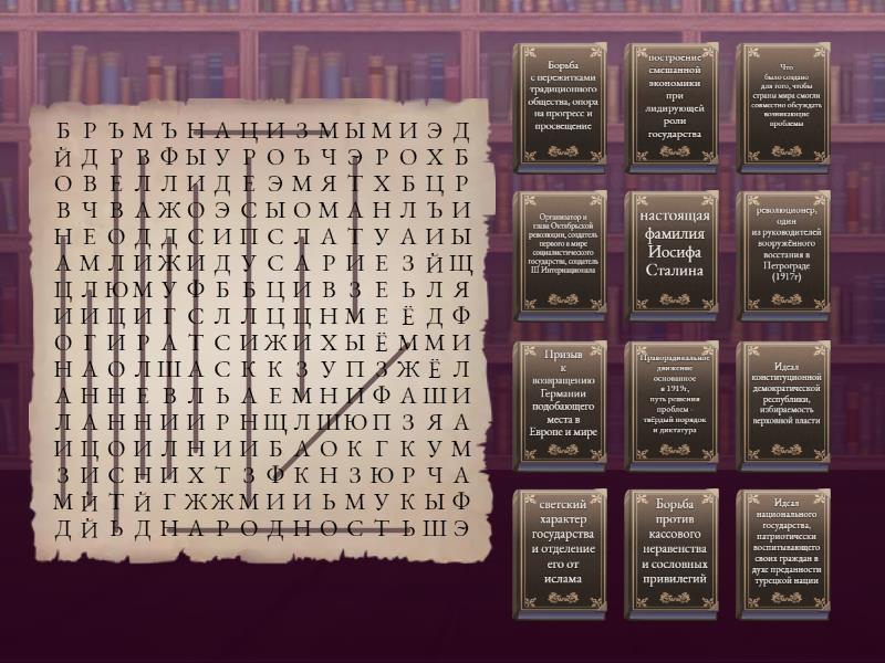 Иосиф Сталин - революционер, один из руководителей вооружённого восстания в Петрограде (1917г), Джугашвили - настоящая фамилия Иосифа Сталина , Национализм - Идеал национального государства, патриотически воспитывающего своих граждан в духе преданности турецкой нации, Этатизм - построение смешанной экономики при лидирующей роли государства, Республиканизм - Идеал конституционной демократической республики, избираемость верховной власти, Лаицизм - светский характер государства и отделение его от ислама, Народность - Борьба против кассового неравенства и сословных привилегий, Революционность - Борьба с пережитками традиционного общества, опора на прогресс и просвещение , Нацизм - Призыв к возвращению Германии подобающего места в Европе и мире, Фашизм - Праворадикальное движение основанное в 1919г, путь решения проблем - твёрдый порядок и диктатура, Владимир Ленин - Организатор и глава Октябрьской революции, создатель первого в мире социалистического государства, создатель III Интернационала, Лига Наций - Что было создано для того, чтобы страны мира смогли совместно обсуждать возникающие проблемы ,
