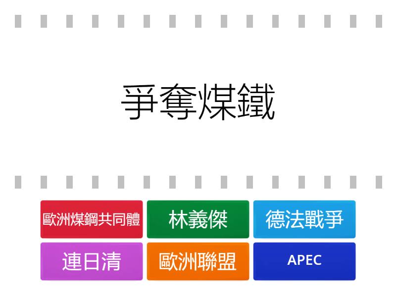 德法戰爭 - 爭奪煤鐵, 歐洲煤鋼共同體 - 總部在比利時的布魯塞爾, 歐洲聯盟 - 2020年英國脫離, 林義傑 - 橫越撒哈拉沙漠, 連日清 - 防治瘧疾, APEC - 各國經濟合作,