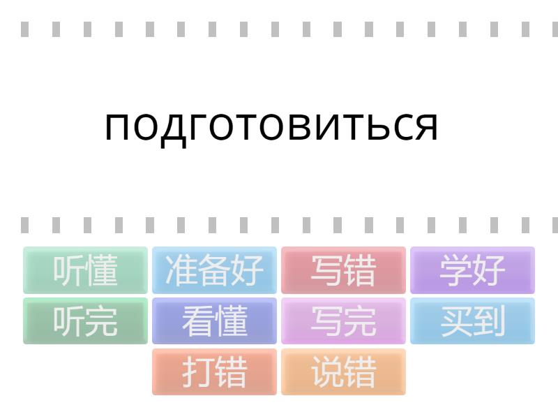 准备好 - подготовиться, 写错 - неверно написать, 说错 - сказать с ошибкой, 听完 - закончить слушать, 写完 - закончить писать, 看懂 - понять, 听懂 - понять (на слух), 打错 - ошибочно позвонить, 学好 - научиться , 买到 - купить,