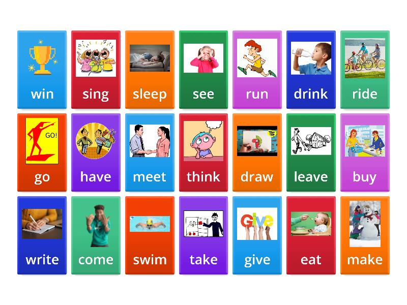 go - went, have - had, see - saw, make - made, write - wrote, buy - bought, eat - ate, sing - sang, come - came, ride - rode, give - gave, drink - drank, draw - drew, take - took, win - won, sleep - slept, think - thought, run - ran, swim - swam, meet - met, leave - left,