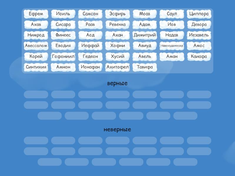 верные: Авель, Гедеон, Эсфирь, Гофониил, Иов, Амос, Аод, Иеффай, Самсон, Циппора, Девора, Ревекка, Ионафан, Раав, Ефрем, Еводия, Синтихия, Иоиль, Тавифа, Хусий, неверные: Адам, Нимрод, Навохудоносор, Аман, Ахитофел, Ахав, Хофни, Финеес, Иезавель, Каиафа, Сисара, Корей, Димитрий, Саул, Моав, Ахан, Авиуд, Надав, Амнон, Авессалом,