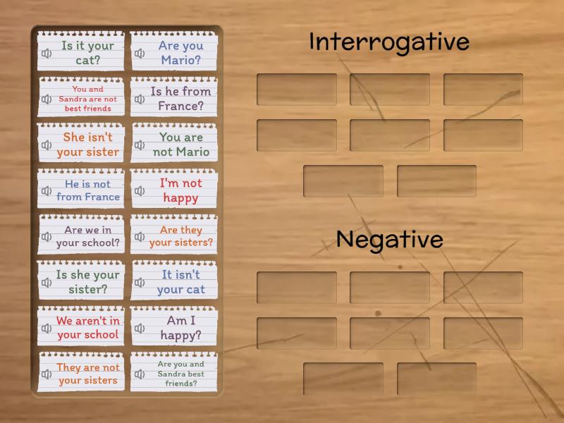 Interrogative: Am I happy?, Are you Mario?, Is he from France?, Is it your cat?, Is she your sister?, Are we in your school?, Are you and Sandra best friends?, Are they your sisters?, Negative: I'm not happy, You are not Mario, He is not from France, It isn't your cat, She isn't your sister, We aren't in your school, You and Sandra are not best friends, They are not your sisters,