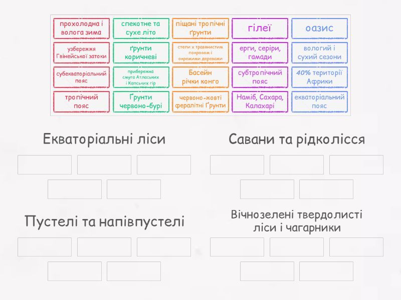 Екваторіальні ліси: узбережжя Гвінейської затоки, червоно-жовті фералітні Ґрунти, гілеї, Басейн річки конго, екваторіальний пояс, Савани та рідколісся: субекваторіальний пояс, вологий і сухий сезони, Ґрунти червоно-бурі, 40% території Африки, степи х травянистим покровом і окремими деревами, Пустелі та напівпустелі: тропічний пояс, Наміб, Сахара, Калахарі, піщані тропічні ґрунти, ерги, серіри, гамади, оазис, Вічнозелені твердолисті ліси і чагарники: прибережна смуга Атлаських і Капських гір, прохолодна і волога зима, ґрунти коричневі, субтропічний пояс, спекотне та сухе літо,